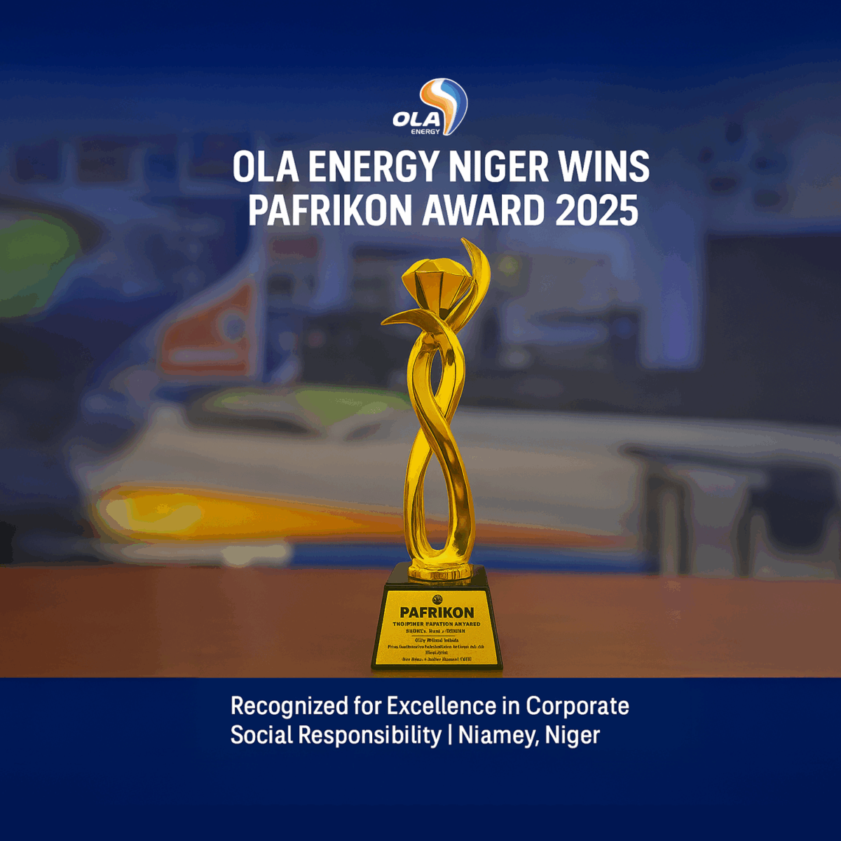 In October 5, 2025, OLA Energy Niger has been honored with the PAFRIKON Award for Excellence in Corporate Social Responsibility (CSR) during the 3rd edition of the Pan-Afrik Icon and Humanitarian Awards held at the Mahatma Gandhi International Conference Center in Niamey.
